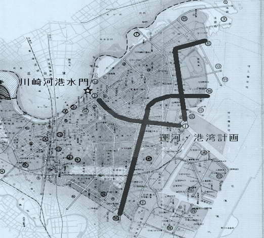 明治末期以降に川崎駅周辺や多摩川の下流域一帯には大規模な工場が次々と進出しました。大正以降には川崎港が整備されたこともあり、今後川崎市は工業地帯としてより発展することが見込まれましたが、当時の多摩川は大雨が降る度に洪水や氾濫を繰り返し、堤防の決壊や橋の流出など甚大な被害をもたらす「暴れ川」と呼ばれ、河川の改修が喫緊の課題になっていました。1924年(大正13年)に内務省(現在の国土交通省)は多摩川の堤防改修工事を行いました。また物資の輸送を円滑にするために多摩川の堤防の一角から川崎市内の内陸部へ運河を建設し、掘削等で生じた土砂を利用して河川や海岸を埋め立てることで住宅や工場、商業地を増やしていく壮大な運河・港湾計画が立てられました。
